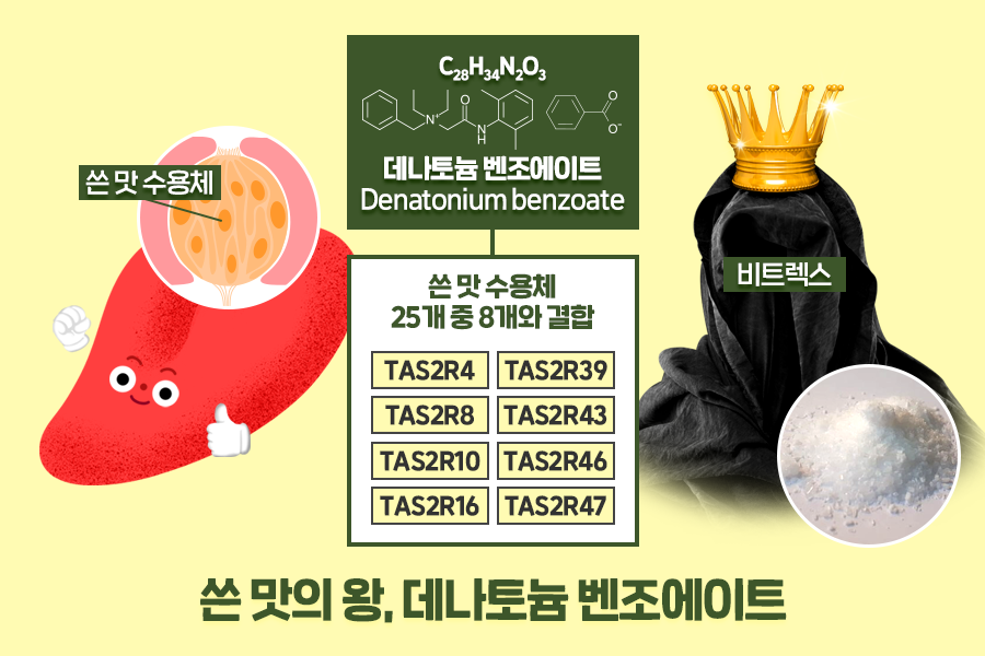쓴 맛이 느껴지려면 물질의 분자와 혀에 있는 쓴 맛 수용체가 결합해야하는데, ‘데나토늄 벤조에이트’의 경우 사람이 보유한 25개의 쓴 맛 수용체 중 무려 8개와 반응을 합니다. 덕분에 적은 양으로도 견딜 수 없는 쓴 맛을 내게 됩니다. 올림픽 규격의 수영장에 새끼 손톱만큼의 양만 투여해도 쓴 맛이 감지된다고 하니 얼마나 쓸 지 예상이 가시나요?