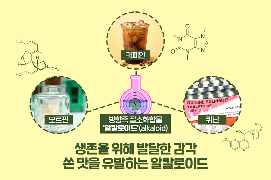알칼로이드는 식물이 자연적으로 만들어낸 화합물로 동물로부터 자신을 보호하기 위해 독성을 띠는 경우가 많습니다. 그러나 실제 독을 만들려면 많은 에너지가 필요해, 독성과 맛이 비슷하지만 에너지가 적게 드는 쓴 맛을 만들어낸 것이죠. 따라서 알칼로이드에서 비롯된 쓴 맛은 사람이든 동물이든 본능적으로 거부하게 되는데요. 독을 멀리하도록 생존을 위해 발달한 감각이기 때문입니다.