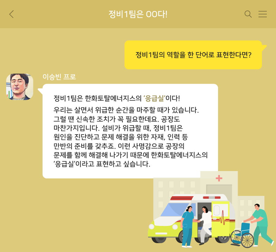 정비1팀은 ‘응급실’이다! 우리는 살면서 많은 위급 상황을 마주합니다. 그럴 때는 신속한 조치로 상황을 무사히 넘겨왔는데요. 이 점은 공장도 마찬가지입니다. 설비가 위급할 때, 정비1팀은 원인을 진단하고 문제를 신속히 해결하기 위해 자재와 인력 등 만반의 준비를 갖추고 있습니다. 안전에 대한 사명감으로 합심해 공장의 문제를 해결하기 때문에 정비1팀을 한화토탈에너지스의 ‘응급실’이라고 표현하고 싶습니다.