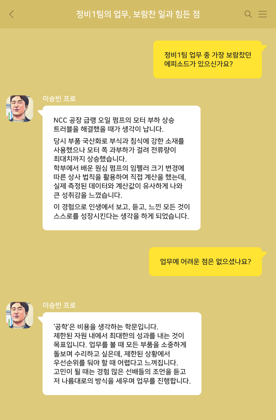 기계공학을 전공하면서 이론이 현장에서는 어떻게 적용되는지 가장 잘 배울 수 있는 곳이 설비 유지보수 직무라고 생각했습니다. 자연스럽게 희망 업무를 그쪽으로 생각하게 되었고요.