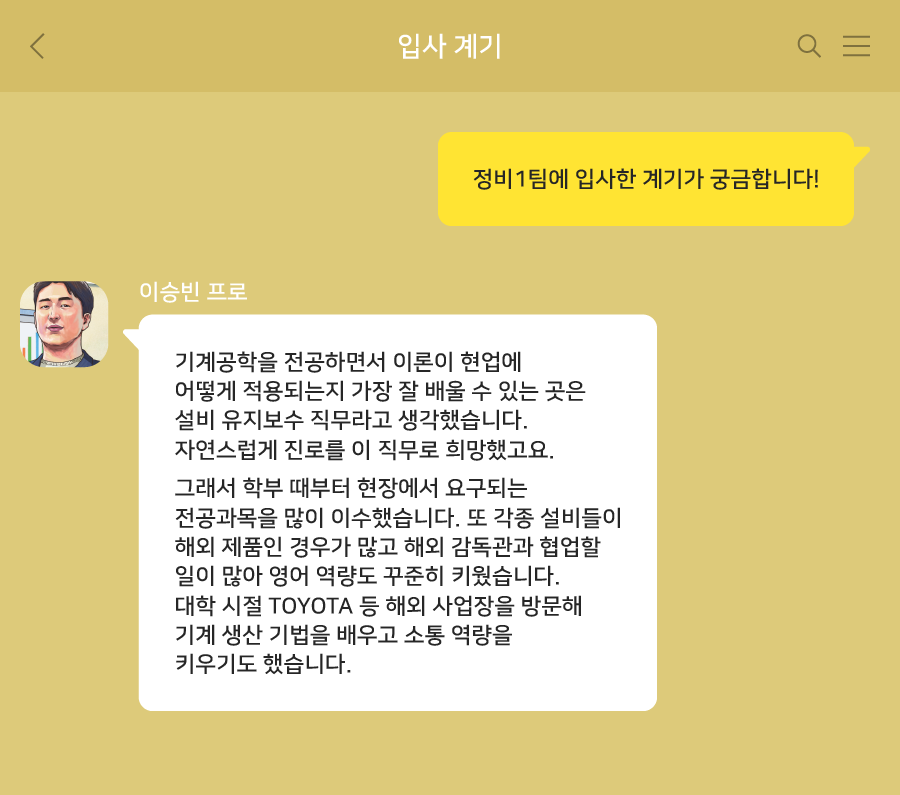 기계공학을 전공하면서 이론이 현장에서는 어떻게 적용되는지 가장 잘 배울 수 있는 곳이 설비 유지보수 직무라고 생각했습니다. 자연스럽게 희망 업무를 그쪽으로 생각하게 되었고요.