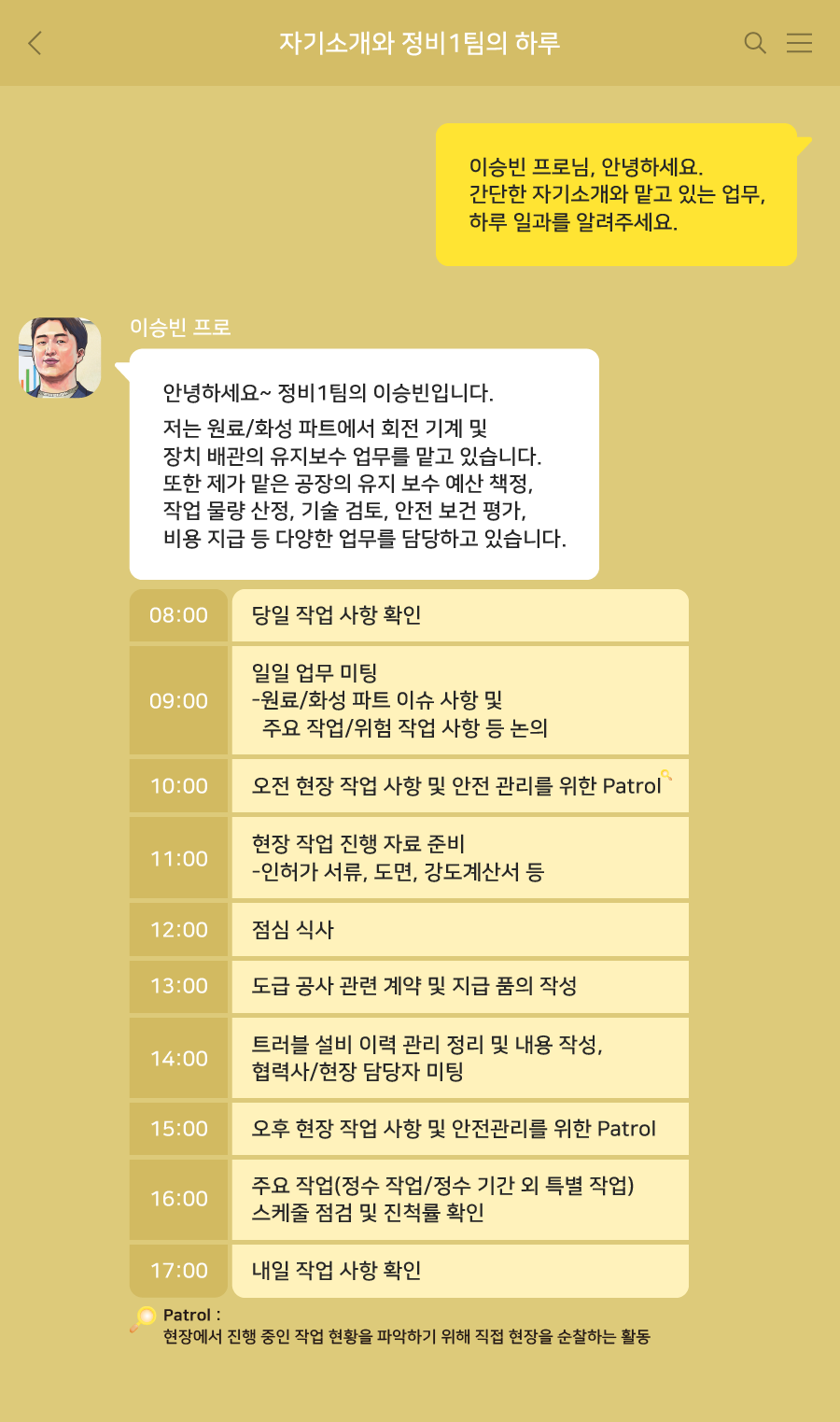 Q. 간단한 자기소개와 하루 일과, 맡고 있는 업무를 알려주세요.
