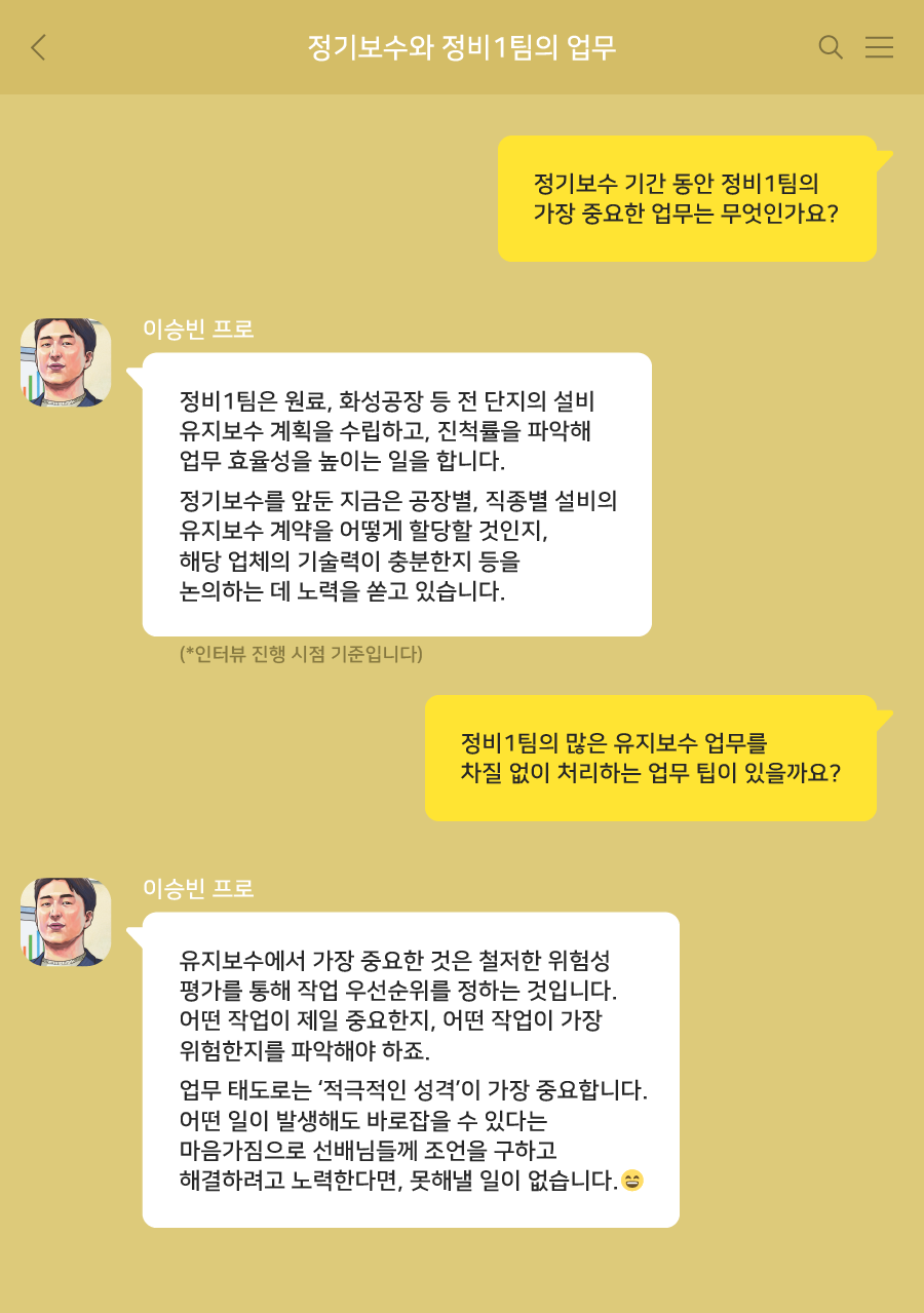 오늘은 안전한 작업장을 만들기 위해 노력하는 정비1팀의 이승빈 프로를 만나 ‘설비의 유지보수’에 충실히 대응하는 업무에 대해 알아보겠습니다.