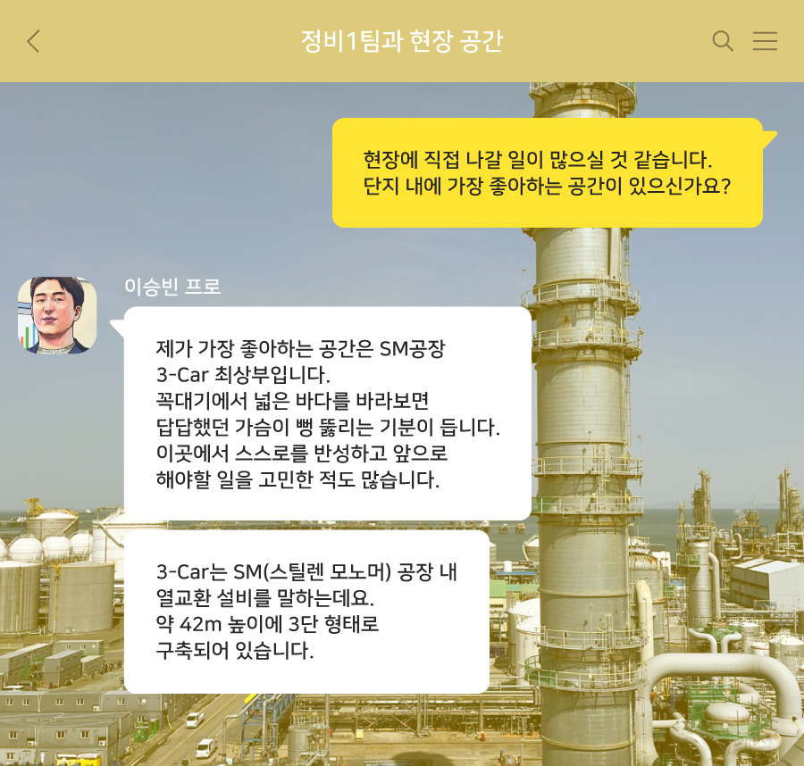 제가 가장 좋아하는 공간은 SM공장 3-Car* 최상부입니다. 높은 꼭대기에 올라가 넓은 바다를 바라보면, 답답했던 가슴이 뻥 뚫리는 기분을 느낄 수 있습니다. 때로는 이곳에서 스스로 생각을 정리하고 과거를 반성하며 고쳐 나갈 점을 찾기도 합니다.