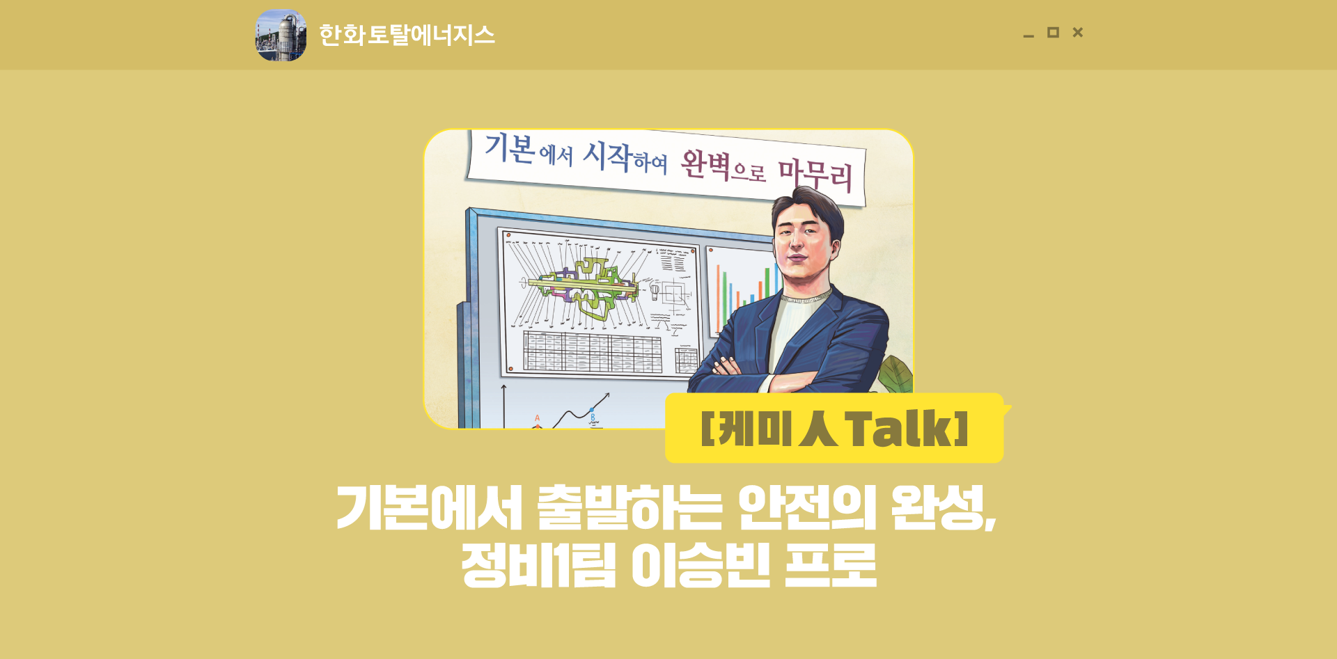 오늘은 한화토탈에너지스 정비1팀의 일원으로 안전한 작업장의 기본을 위해 노력하는 이승빈 프로의 이야기를 들어보았습니다. 이승빈 프로와 정비1팀의 노력이 있어 한화토탈에너지스의 공장 기계들과 많은 직원들이 무사히 하루를 보내고 있는 것 같습니다. ‘기본에서 시작하여 완벽으로 마무리’라는 정비1팀 슬로건답게 단단한 기본으로 안전의 마무리를 책임지는 정비1팀의 신념이 한화토탈에너지스를 든든하게 지탱해주길 바라며 마치겠습니다.