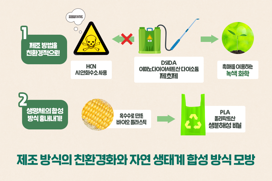 먼저 제조 방식을 친환경적으로 바꾸는 것은 촉매 방식을 사용하거나, 화학물질 합성 과정에서 유해 물질을 사용하지 않는 것입니다. 대표적인 사례로는 제초제가 있는데요. 이전에는 제초제에 들어가는 성분 ‘이미노다이아세트산 다이소듐’을 얻기 위해 독극물인 시안화수소를 사용했습니다. 이 과정에서 포름알데히드가 포함된 폐기물이 발생하기도 했죠. 녹색화학이라는 개념이 생긴 뒤 화학자들은 촉매를 사용하는 방법을 연구했습니다. 유독성 물질을 사용하지 않고 ‘다이에탄올아민’을 산화시켜 ‘이미노다이아세트산 다이소듐’을 얻으면서 녹색화학의 가능성을 발견했답니다.