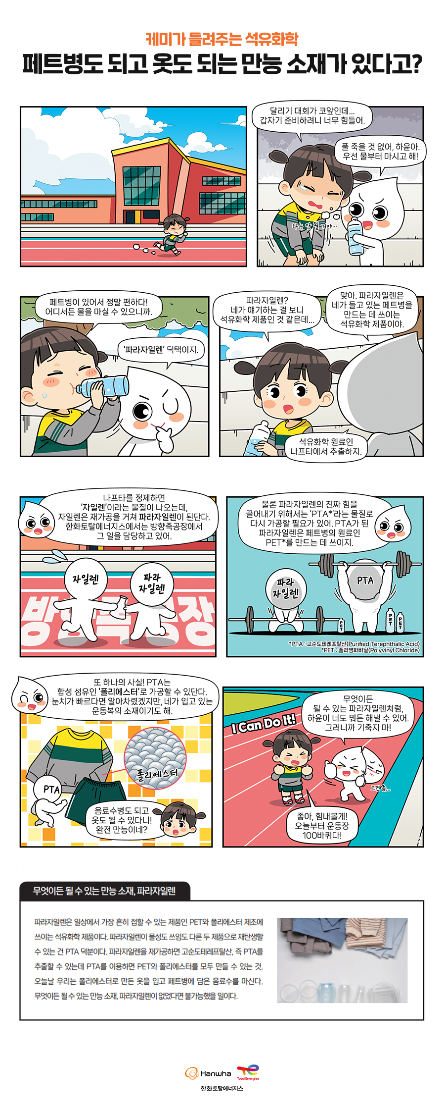 끝이 없는 석유화학의 변신! 여러분은 알고 계신가요? 세상에는 페트병이 될 수도, 운동복이 될 수도 있는 소재가 있다구요! 한화토탈에너지스의 마스코트 케미가 알려주는 만능 소재 ‘파라자일렌(paraxylene)’에 대해 알아보아요~
