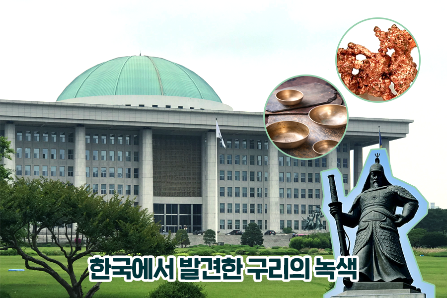 우리나라에도 미국의 자유의 여신상처럼 산화되어 녹색이 된 구리를 찾을 수 있답니다. 바로 여의도에서요! 태권V가 출동한다는 국회의사당 지붕은 구리로 만들어져 원래는 붉은 빛의 갈색을 띠었는데요. 마찬가지로 시간이 지나면서 매연과 눈, 비의 영향으로 녹색으로 산화하였습니다.