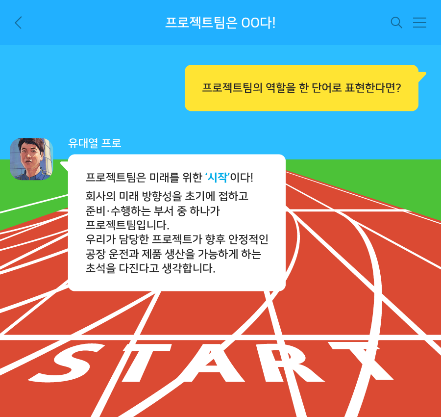 프로젝트팀은 미래를 위한 ‘시작’이다! 회사의 미래 방향성을 초기에 접하고 준비·수행하는 부서 중 하나가 ‘프로젝트팀’입니다.