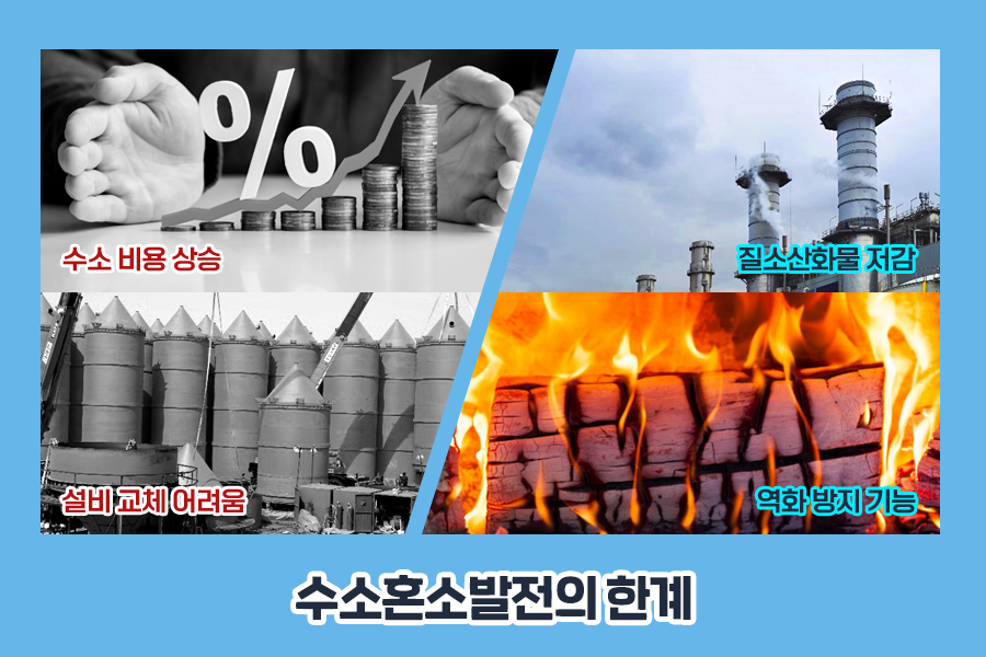 천연가스에 맞춰져 있는 기존 설비와 수소 간에도 문제가 있습니다. 기존의 가스 터빈은 화염이 중심에 있다고 가정하고 냉각 기술을 적용했는데요. 수소의 비율이 높아지면서 특정 부분에 열이 가해져 기계적 결함이 발생할 수 있습니다. 수소가 기존 연료의 7~8배 가량의 너무 빠른 속도로 연소하는 속성도 화염이 역류하는 화염 역화 현상을 발생시킬 수 있고요.