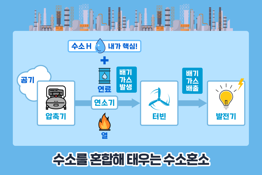 수소혼소발전이란 수소를 혼소해 전기를 생산하는 것입니다. 여기서 혼소란 ‘혼합 연소’의 줄임말로, 풀어서 설명하자면 수소혼소발전은 다른 연료와 수소를 혼합해 태워 전기 에너지를 생산하는 것입니다.