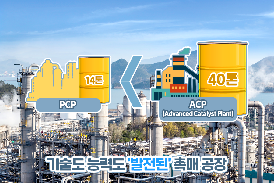 ACP는 ‘Advanced Catalyst Plant’의 약자로 기존 촉매 공장 대비, 기술·설비·작업환경 등 모든 면에서 Advanced라는 이름처럼 진일보한 촉매 공장입니다. 지난 2021년부터 추진되어 올해 4월 드디어 완공이 되었습니다.