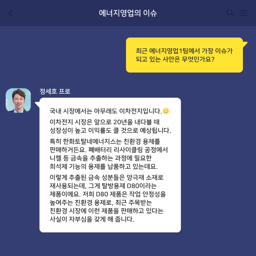 상대적으로 시황의 영향을 덜 받으며 꾸준히 영업이익을 내면서도, 동시에 친환경 시장 용도로 용제 제품들을 납품하기 때문에 에너지영업1팀을 우리 회사의 ‘미래’라고 표현하고 싶습니다.
