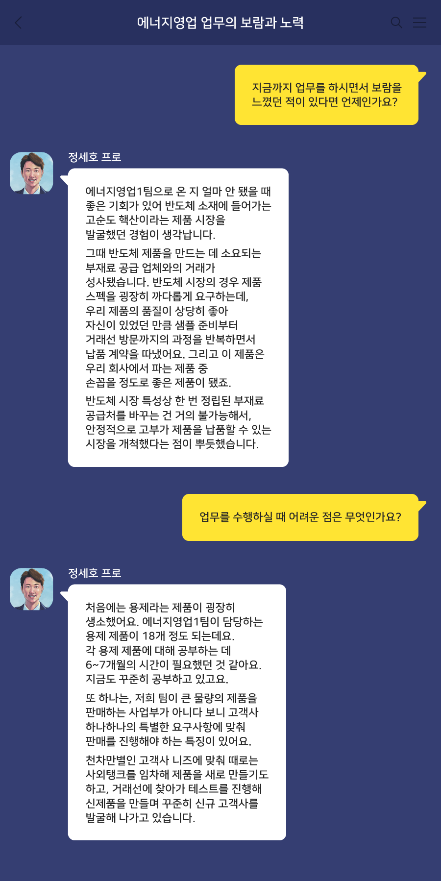 안녕하세요! 저는 2014년 7월에 입사해 현재 에너지영업1팀에서 용제 내수영업을 담당하고 있는 정세호 프로입니다. 원료구매팀에서 약 6~7년 일했고, 영업팀으로 옮긴 건 3년 정도 됐어요.