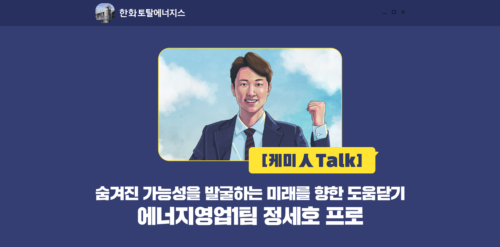 오늘은 빠르게 변화하는 시대 속에서 한화토탈에너지스의 미래를 그리는 에너지영업1팀의 정세호 프로를 만나 ‘에너지영업’ 업무에 대해 알아보겠습니다.