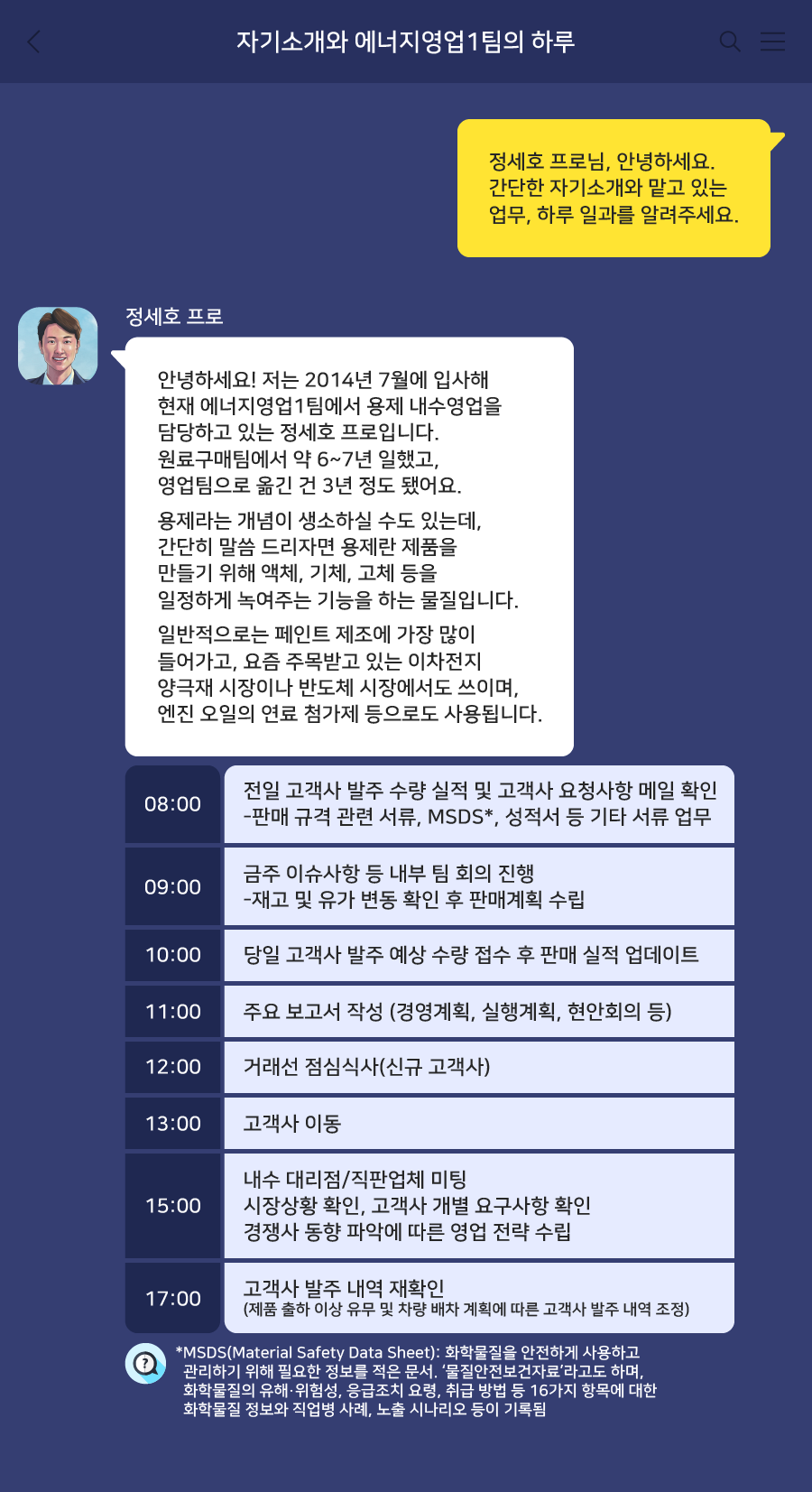 안녕하세요! 저는 2014년 7월에 입사해 현재 에너지영업1팀에서 용제 내수영업을 담당하고 있는 정세호 프로입니다. 원료구매팀에서 약 6~7년 일했고, 영업팀으로 옮긴 건 3년 정도 됐어요.