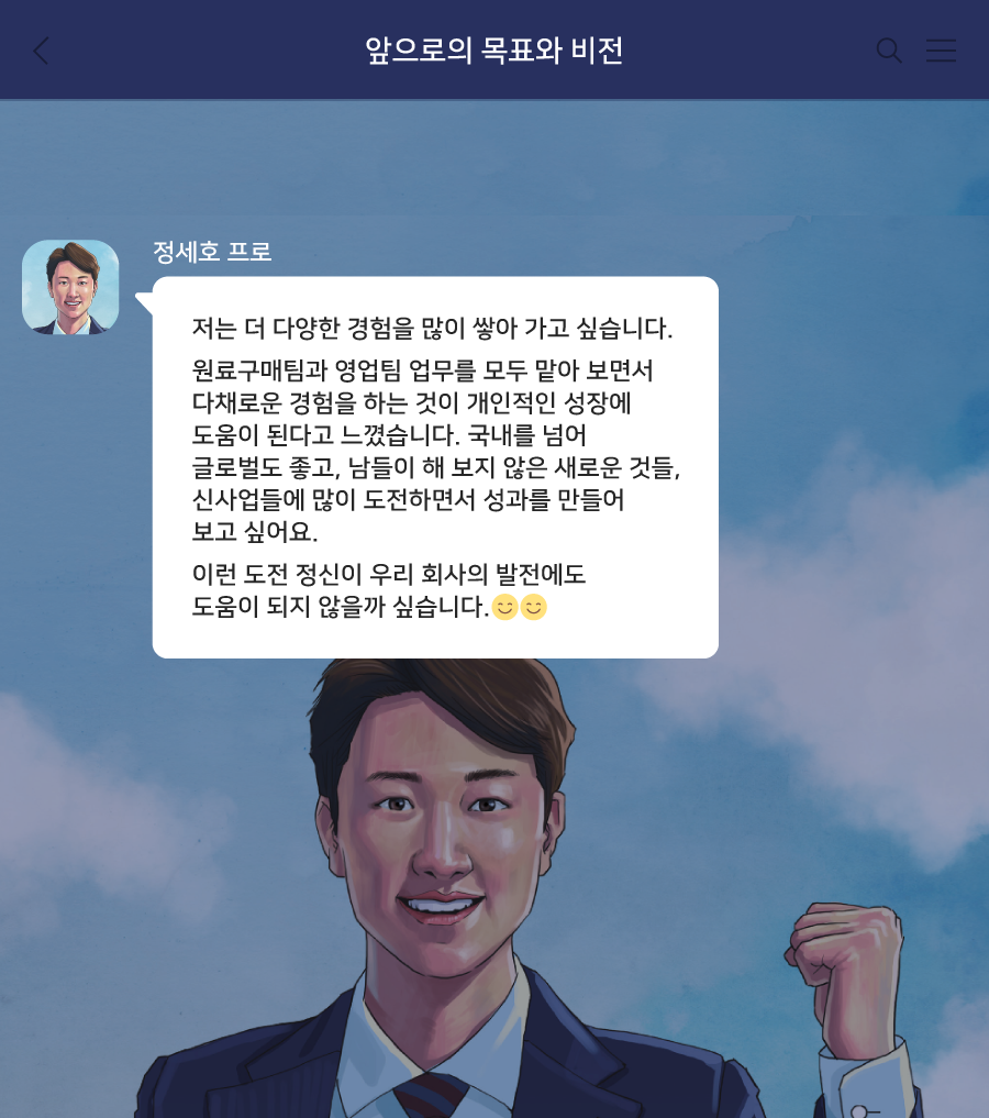 저는 유연하게 대응하는 것이 중요하다고 생각합니다. 결국 저희와 함께 거래하는 고객사와도 상생할 수 있도록 상황을 잘 조정해주는 게 저의 역할이라고 생각하죠.