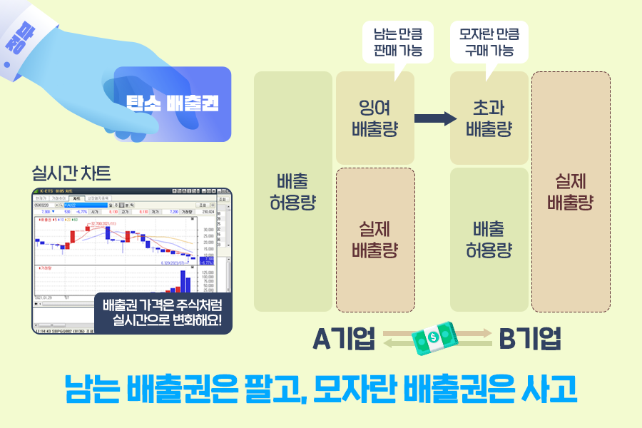 온실가스 배출권 거래제란, 국내에서 사업을 진행하는 기업들 가운데 연간 온실가스 배출량이 25,000톤 이상인 기업을 대상으로 진행하는 제도입니다. 정부는 대상 업체들에게 온실가스 배출권을 할당하는 방식으로 배출량을 제한하고 감축을 유도하고 있죠. 각 업체는 할당 받은 배출 허용량의 잉여분과 부족분을 시장에서 거래하며 부가 수익을 내고 있고요.