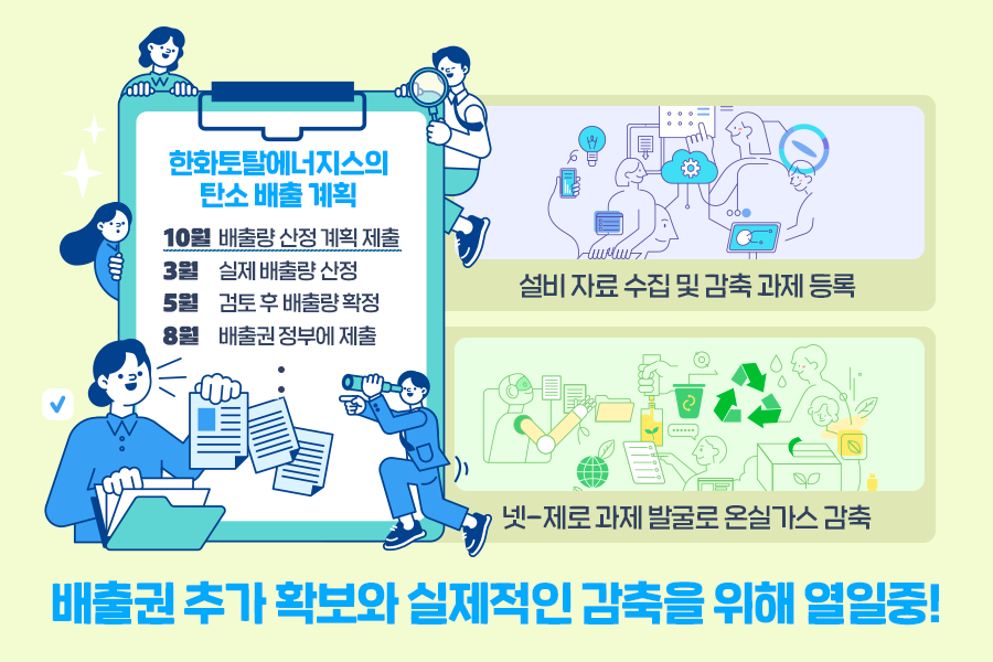한화토탈에너지스의 기후변화대응팀은 배출권 거래제와 관련해 신·증설된 설비에 대해 자료를 수집하고 소명하여 추가 할당을 받거나 온실가스 감축 과제를 등록하는 등 배출권 추가 확보에 힘쓰고 있습니다. 또한 넷 제로(Net-Zero) 과제 발굴을 통해 실제적인 감축에도 힘쓰고 있습니다. 특히 올해부터 향후 10년간 전사 에너지 로드맵을 수립하고 에너지 최적화 스터디를 진행하고 있는데요. 이 프로젝트는 공정간 통합 스터디와 적극적인 설비 투자를 통한 프로세스 개조, 신기술 적용 등 다양한 방법을 활용하여 획기적인 에너지 절감 달성을 목표로 하고 있습니다.