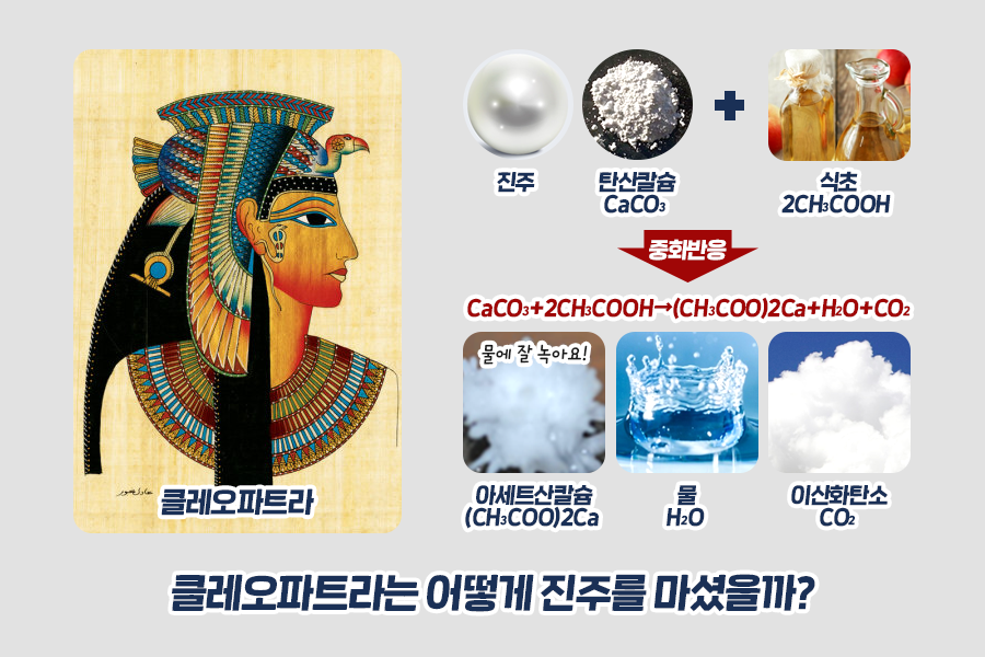 이 일화에 숨은 진실은, 클레오파트라가 진주를 넣은 물잔이 식초로 가득 차 있었다는 것입니다. 식초(2CH3COOH)는 아세트산을 함유하고 있어 신맛과 함께 산성을 띄고 있습니다. 반면 진주는 조개 체내에서 생성된 탄산칼슘(CaCO3)이 응고된 형태로 염기성이기 때문에 산성에 취약하죠. 진주가 식초와 만나면 중화 반응이 일어나며 아세트산칼슘과 물, 이산화탄소가 생성되는데요. 아세트산칼슘은 물에 잘 녹기 때문에 잔 안에는 물처럼 보이는 액체 밖에 남지 않게 됩니다. 이 비밀을 모르는 사람이라면, 진주가 물에 녹았다고 착각을 할 수 있죠.
