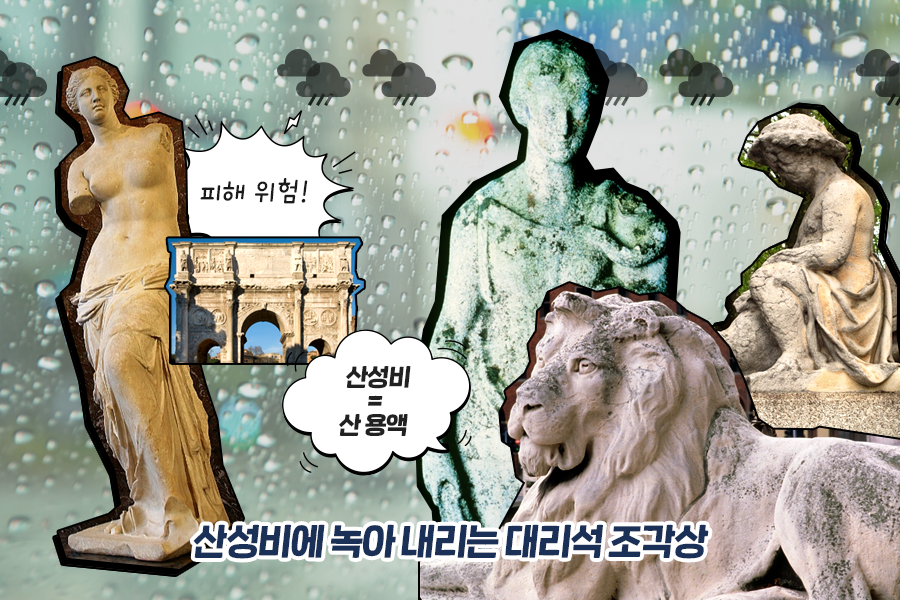 우리에게도 유명한 파리의 에투알 개선문이나 미켈란젤로의 다비드 상, 밀로의 비너스 상도 모두 석회암과 대리석으로 장식되고 조각되어 산성비의 피해를 입을 가능성이 있다고 해요. 대기오염물질을 줄이지 않으면 앞으로는 멋진 석조 건물을 보기 어려울지도 모르겠네요!