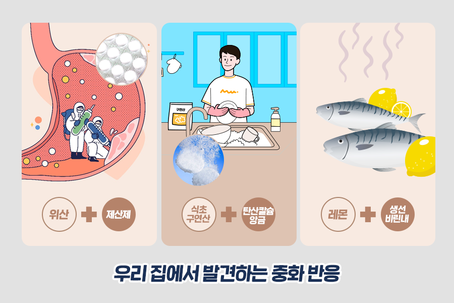 이 외에도 과도한 위산 때문에 쓰린 속을 염기성 물질이 포함된 제산제로 달래주는 것도 중화 반응에 속합니다. 생선의 비린내를 내는 염기성 물질에 산성인 레몬을 뿌려 냄새를 잡는 것도 중화 반응에 속하고요.