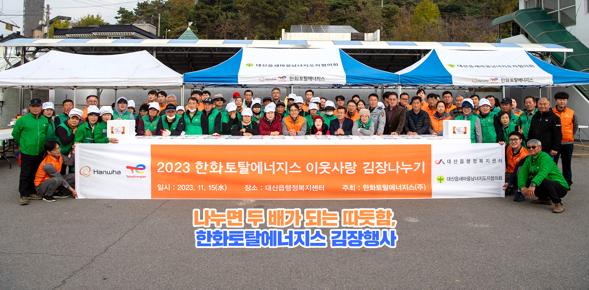 올해 만들어진 김치는 모두 서산 지역에서 난 배추를 사용하고 지역 농산물로 양념을 만들어 지역경제 활성화에도 보탬이 됐습니다. 이번 김장 행사가 지역 경제 활성화는 물론, 어려운 이웃을 향한 작은 나눔이 되어 올 겨울을 따듯하게 잘 보낼 수 있는 힘을 주었습니다. 한화토탈에너지스는 앞으로도 매년 김장 행사를 개최할 예정입니다. 소외된 이웃을 향한 나눔의 손길을 멈추지 않는 한화토탈에너지스가 될 것을 약속드리며 오늘의 소식 마치겠습니다. 안녕~