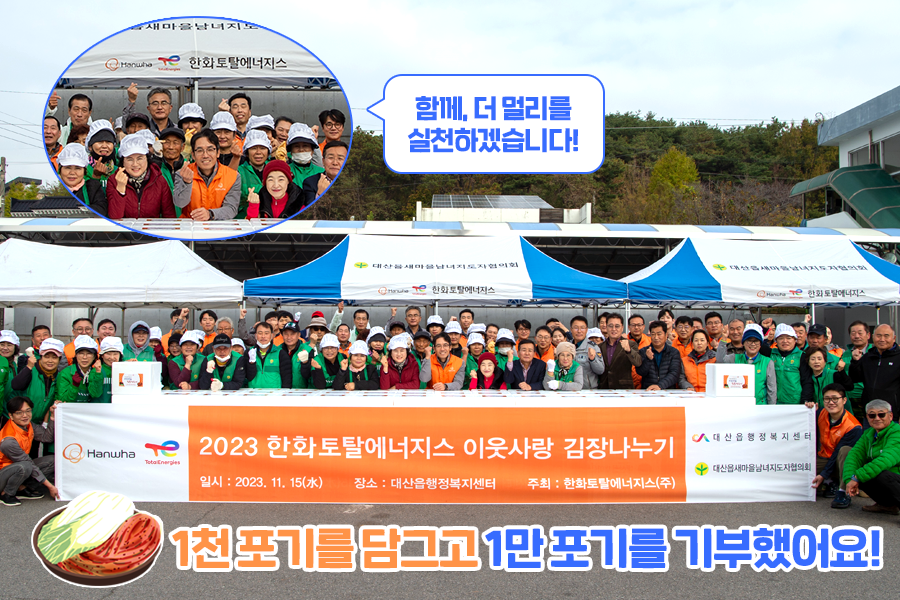 “2023 한화토탈에너지스 이웃사랑 김장 나누기” 행사에서는 총 1천 포기의 김치가 만들어졌는데요. 한화토탈에너지스는 여기에 더해 총 1만 포기의 김장 김치를 서산시 자원봉사센터, 가족센터, 장애인복지관 등을 통해 지역 내 어려운 이웃들에게 전달할 예정입니다.