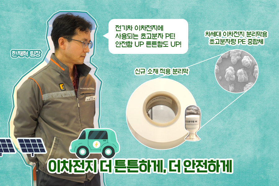 홍원종 프로: “최근 CO2 등 환경 문제가 많잖아요. 전세계적으로 전기 에너지를 사용하려는 움직임이 늘어나면서 전기차의 수요도 커졌고요. 이 때문에 배터리의 수요도, 배터리에 사용되는 이차 전지와 PE제품의 수요도 커질 것입니다. 저희가 개발한 소재도 수요가 증가해 더 많은 생산과 쓰임이 있기를 바랍니다.”