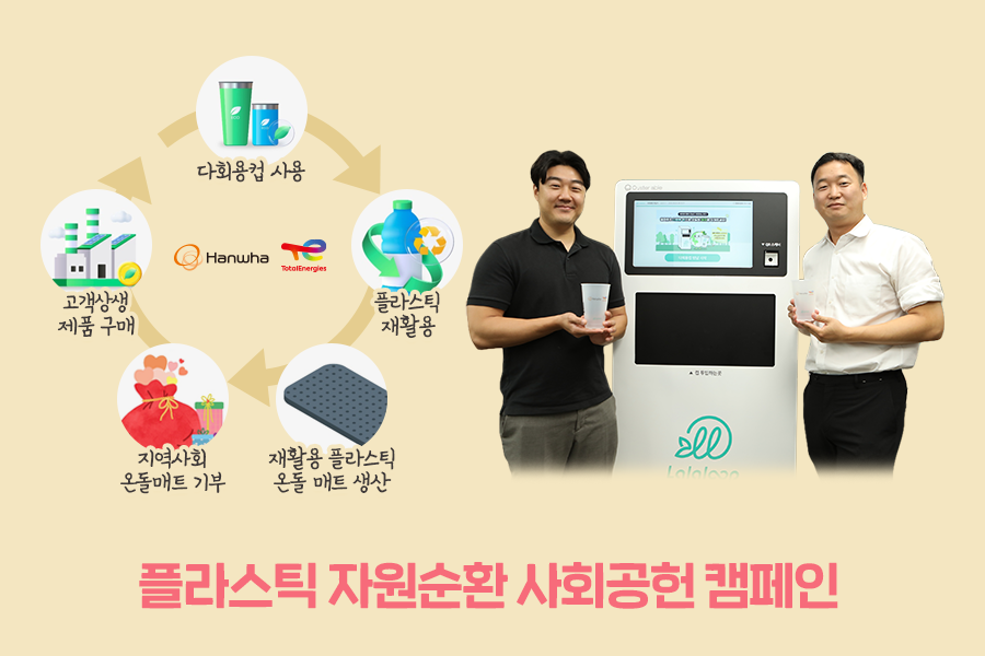 이러한 재활용컵 사용 캠페인이 어떻게 사회공헌 캠페인으로 확대되었는지 살펴볼까요? 한화토탈에너지스는 정해진 사용횟수에 도달한 재활용컵을 물리적으로 재활용한 플라스틱을 원료로 활용해 생산한 온돌매트를 난방설비가 필요한 이웃에 기증하는 캠페인을 시작하였습니다. 서울시사회복지협의회와 함께 재활용 플라스틱 원료 고객사로부터 온돌매트를 구매하고 등촌자활센터와 마포자활센터에 온돌매트 시공을 진행했죠.