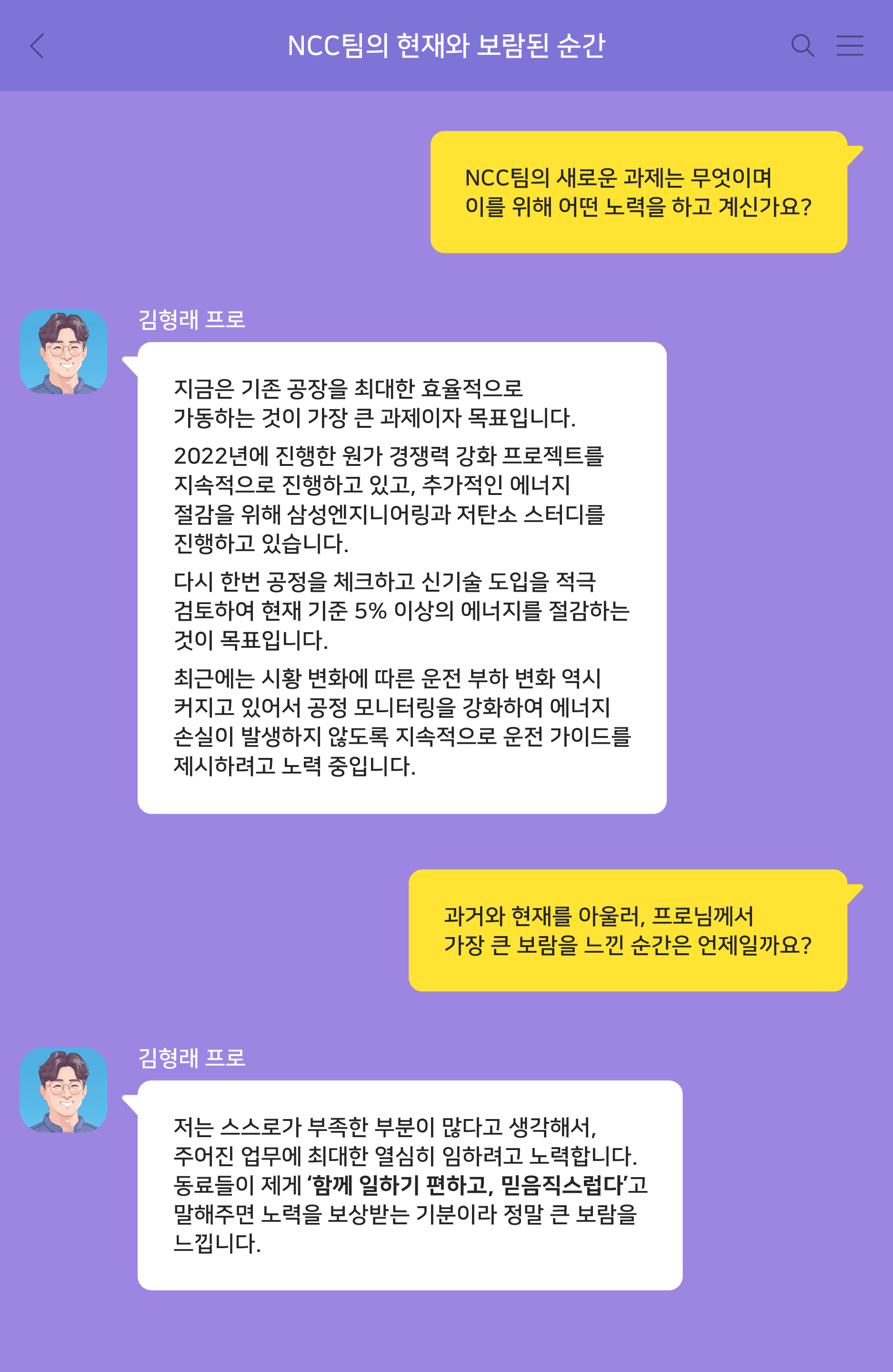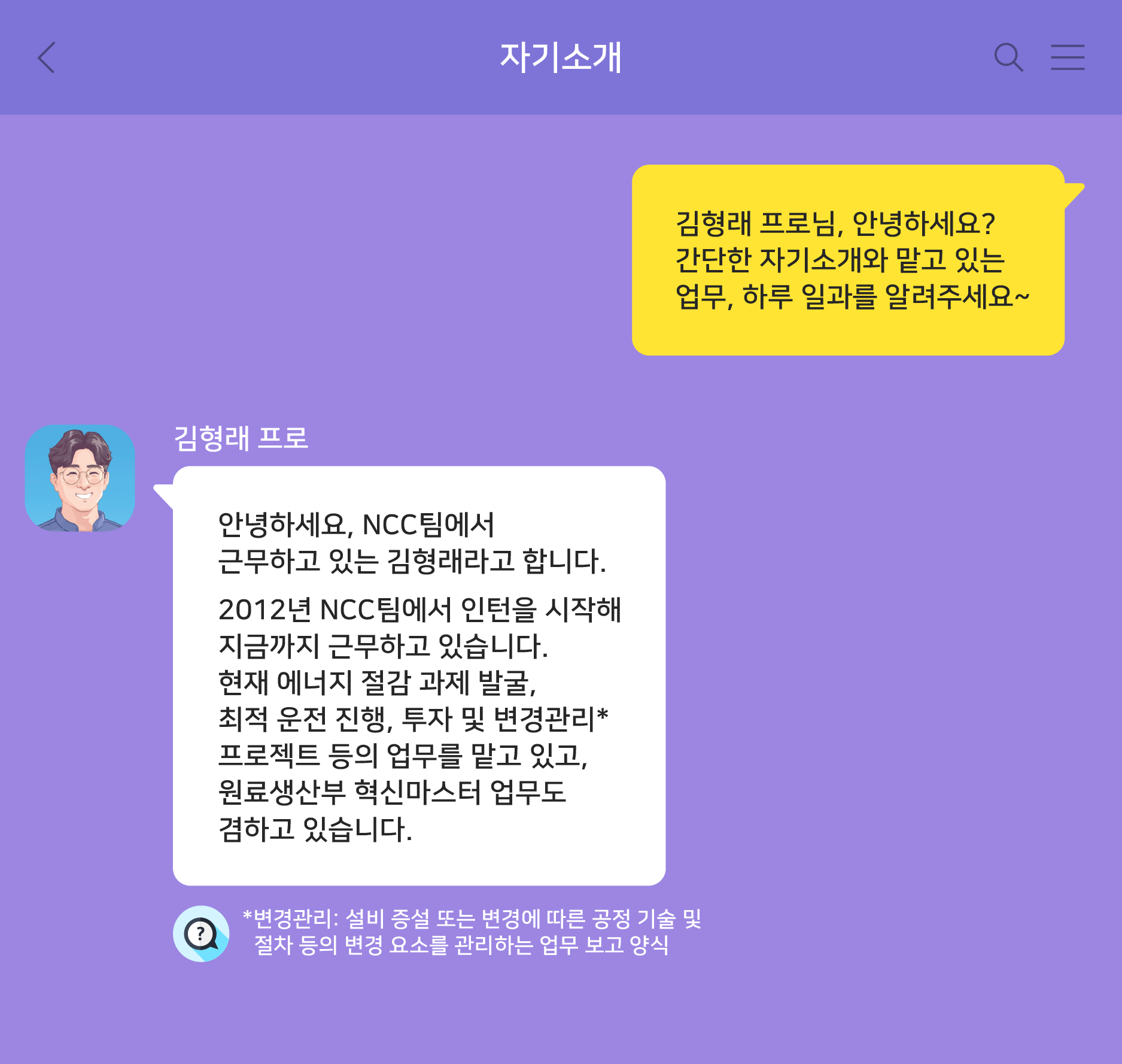 2012년 NCC팀에서 인턴을 시작해 지금까지 근무하고 있습니다. 현재 에너지 절감 과제 발굴, 최적 운전 진행, 투자 및 변경관리*프로젝트 등의 업무를 맡고 있고, 원료생산부 혁신마스터 업무도 겸하고 있습니다.
