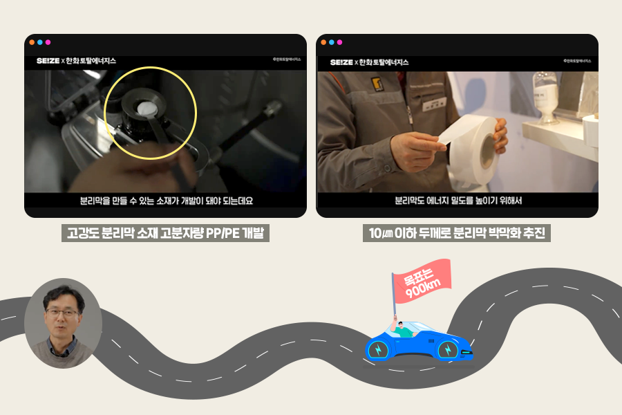 한재혁 팀장은 분리막 소재 개발에 힘써 더 멀리 가는 전기차 배터리를 꿈꾸고 있는데요. 최종 목표는 한 번 완충으로 900km까지 가는 전기차라고 합니다. 서울에서 부산을 왕복할 수 있는 거리죠. 에너지 효율을 높이기 위해 분리막 박막화, 고강도 소재 개발 등을 진행중입니다.