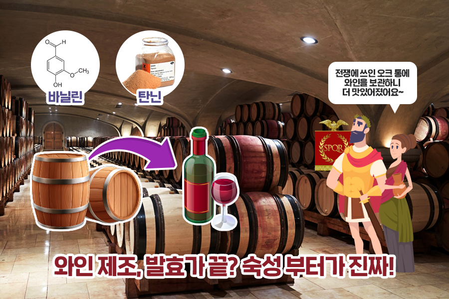 오크통에 와인을 숙성하게 되면 참나무의 분자인 ‘바닐린(C8H8O3)’과 ‘탄닌’이 와인에 스며듭니다. 폴리페놀 성분인 바닐린은 와인에 바닐라 향을 첨가하며, 참나무 조직에서 추출되는 탄닌은 와인의 산화를 방지합니다.
