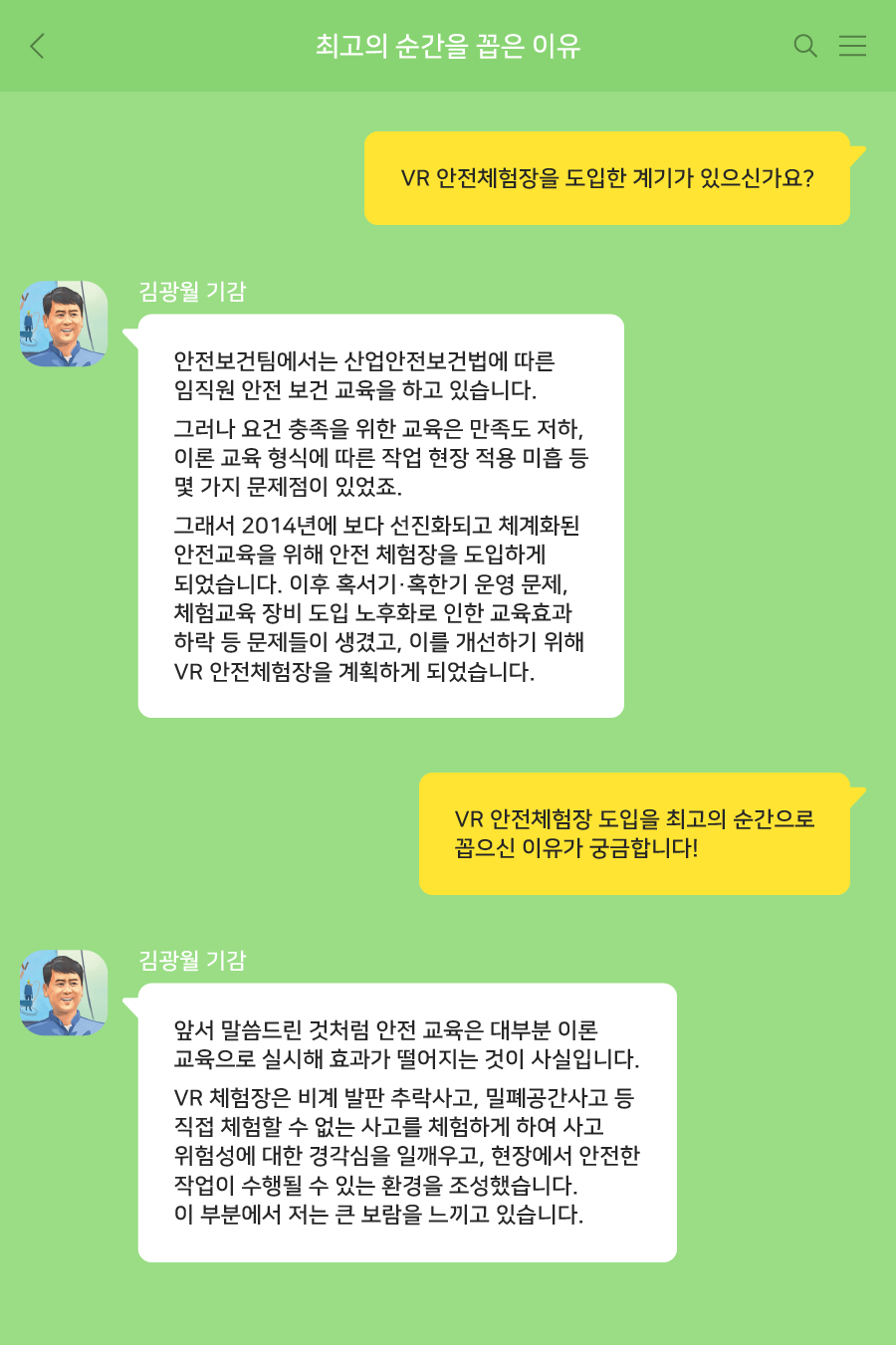 저의 최고의 순간은 대산공장에 VR 안전체험장을 도입했던 순간입니다.