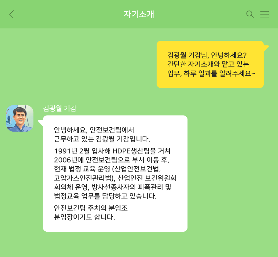 1991년 2월 입사해 HDPE생산팀을 거쳐 2006년에 안전보건팀으로 부서 이동 후, 현재 법정 교육 운영(산업안전보건법, 고압가스안전관리법), 산업안전 보건위원회 회의체 운영, 방사선종사자의 피폭관리 및 법정교육 업무를 담당하고 있습니다.