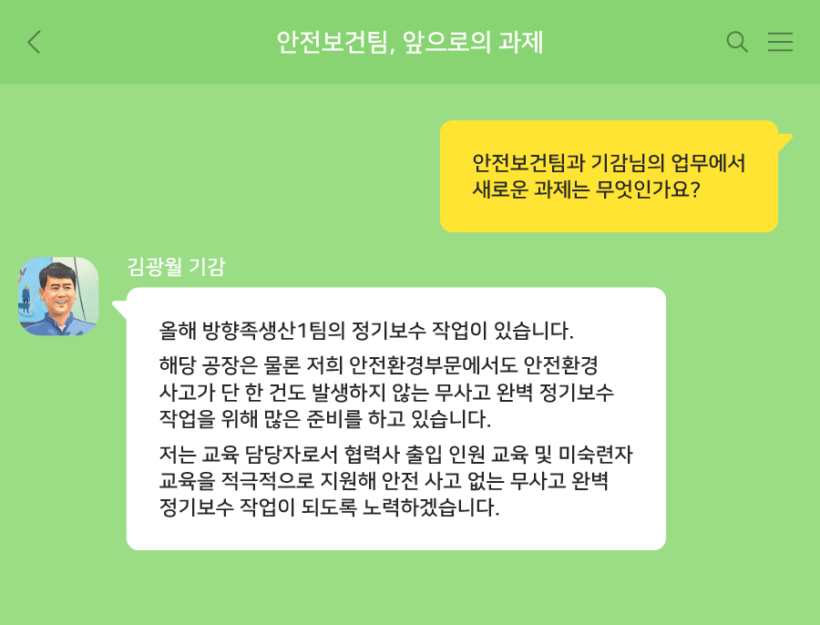 생산부서 근무 시 몰라서 지키지 못했던 사례 등을 후배들에게 전달하고, 현장 안전과 관련해 부족한 부분을 채워주는 교육 강사 역할을 수행할 때 가장 큰 보람을 느끼는 것 같습니다.