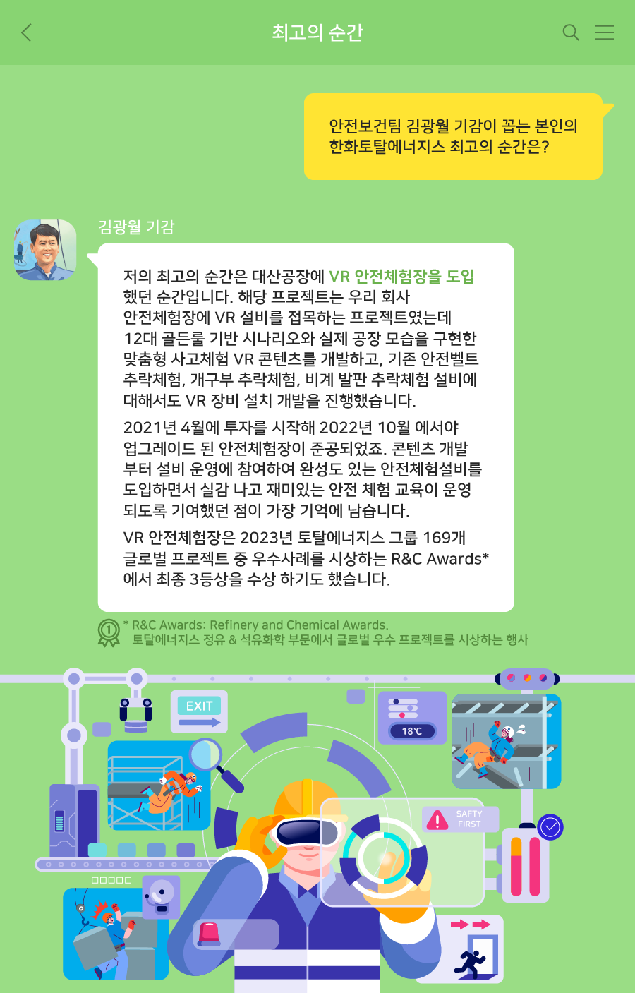 저의 최고의 순간은 대산공장에 VR 안전체험장을 도입했던 순간입니다.