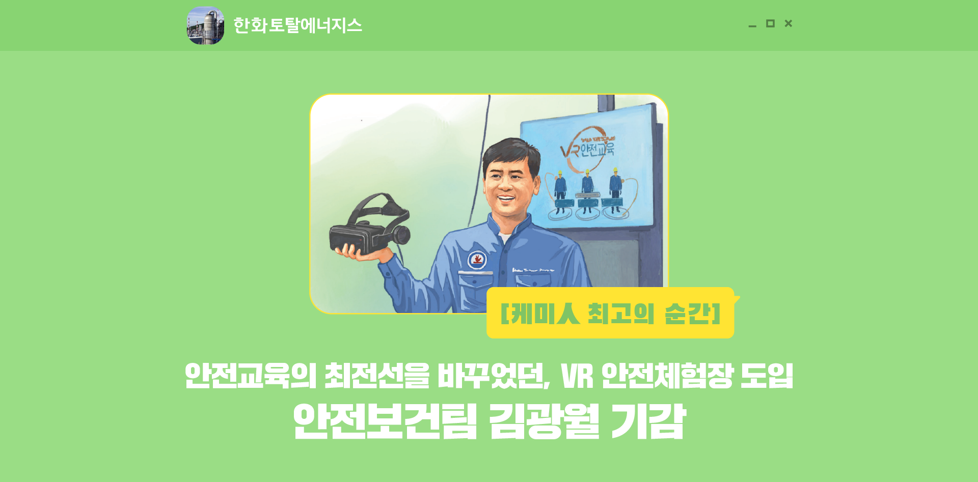 오늘은 한화토탈에너지스 안전보건팀의 일원인 김광월 기감을 만나 그의 최고의 순간인 ‘VR 안전체험장 도입’에 대해 들었습니다. 안전보건팀과 김광월 기감의 노력으로 한화토탈에너지스 임직원들은 지루하지 않은, 실감나는 안전 교육을 받을 수 있었습니다.