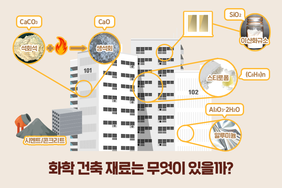 화학 건축 재료 중 가장 유명한 것은 바로 ‘시멘트’입니다. 건물은 물론, 도로를 만드는 데도 사용되는 시멘트는 탄산칼슘(CaCO3)이 주성분인 석회석을 가열해 만듭니다. 석회석을 가열하면 생석회인 산화칼슘(CaO)과 이산화탄소(CO2)가 되며 산화칼슘을 점토와 혼합하면 시멘트가 제조되는데요. 이렇게 만들어진 시멘트에 모래, 자갈 등을 섞고 물을 넣어 반죽하면 우리가 흔히 아는 콘크리트가 됩니다.