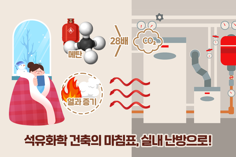 화석연료 중 가장 효율이 좋은 메탄(CH4)은 이산화탄소보타 28배 높은 열을 가두는 능력이 있는데요. 메탄 등이 포함된 화석 연료를 연소하여 산화시키면 다량의 열과 이산화탄소(CO2), 그리고 물(2H2O)이 발생합니다. 이 과정에서 발생하는 열과 물이 끓을 때 나오는 증기로 난방을 하게 되죠.