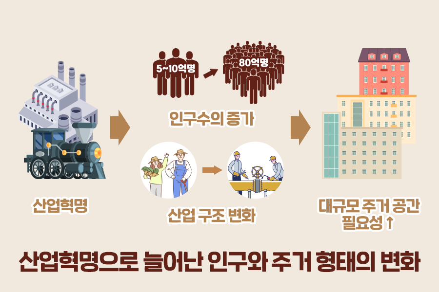 산업혁명으로 인해 기술의 발전과 생산량의 증가가 시작되었고, 농업에서 산업으로 생활 양식이 변화하면서 사람들은 도시로 몰려들기 시작했는데요. 더 이상 단층이나 저층의 건물로는 사람들을 수용할 수 없어 더 높은 건물, 대규모 주거 공간의 필요성이 대두되었습니다.