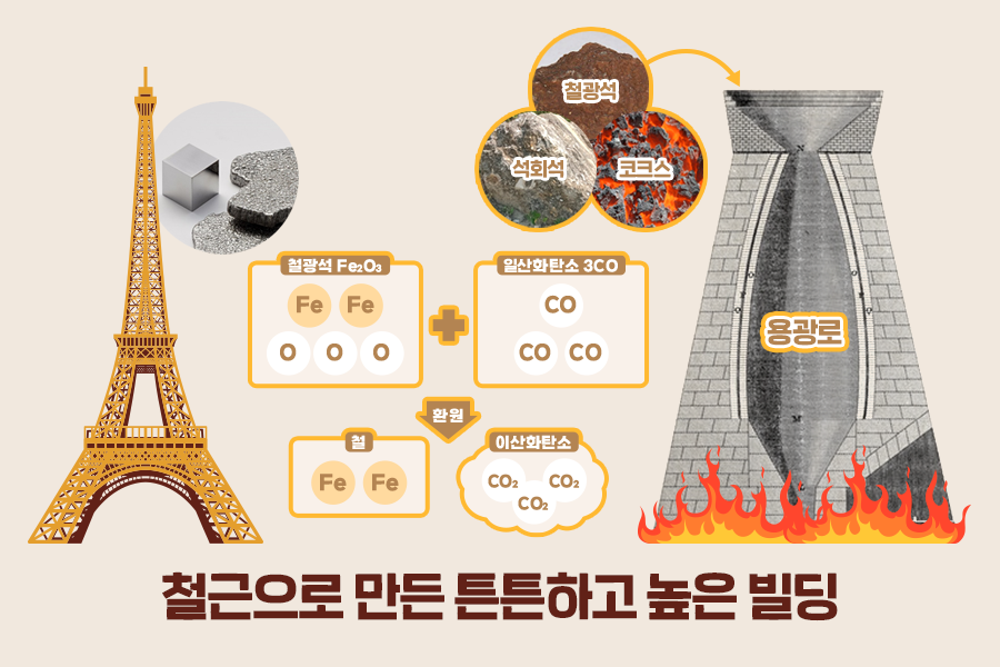 우리가 아는 철은 ‘철광석’이라는 돌에서 나오는데요. 철광석 속 철은 산화철(Fe2O3) 형태로 존재합니다. 이 철광석을 용광로에 넣고, 코크스를 연소해 일산화탄소(3CO)와 결합시키면 철(2Fe)과 이산화탄소(3CO2)로 환원됩니다. 이 과정에서 불순물을 제거하는 역할을 하는 석회석을 함께 넣는데 여러 과정을 거쳐 최종적으로 건축 재료로 사용하는 철이 만들어집니다.