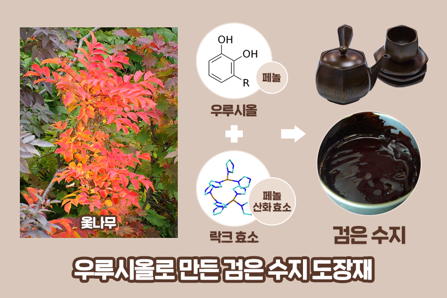 옻칠이 오랜 역사를 가진 도장법이 된 이유는 옻나무 수액의 우루시올이라는 물질 덕분입니다. 우루시올은 휘발성 페놀 화합물로 수액에 함께 들어있는 락크 효소와 반응해 공기 중 산소를 흡수하는데요. 흡수된 산소는 목재를 부식 시키지 않고 옻과 반응해 검은 수지로 변합니다.