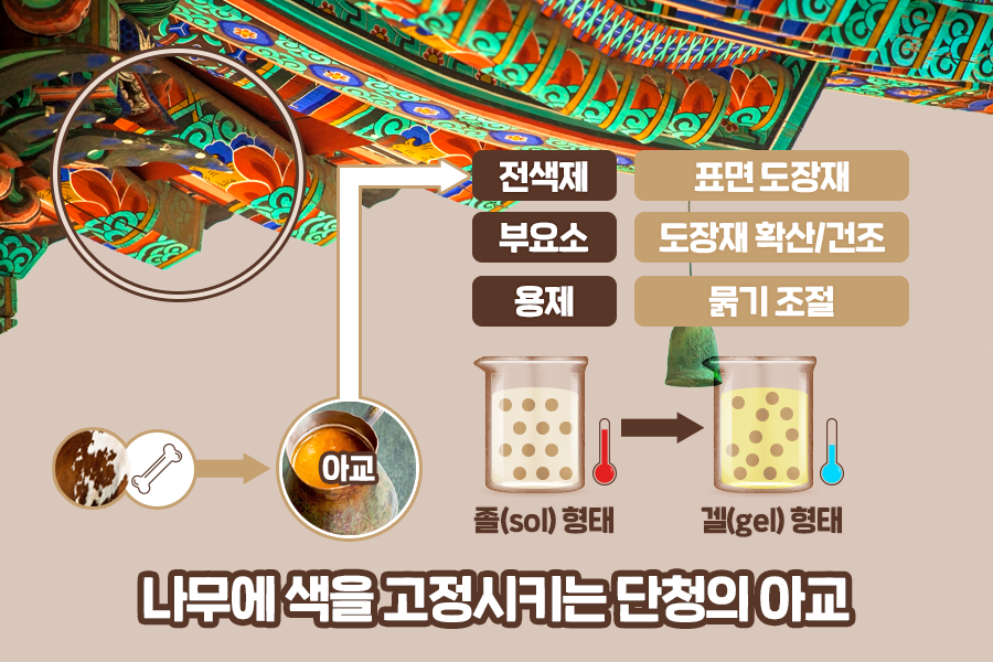 전통 단청의 전색제는 아교를 많이 사용합니다. 아교란 동물의 가죽과 뼈를 고아 만든 접착성 물질로 온도에 따라 졸-겔 변이 가 일어나며 안료를 목재에 밀착시키는 역할도 수행합니다.