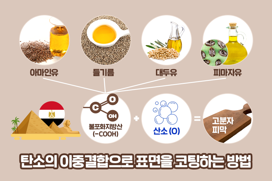 2,500년 전 이집트는 목재 도구의 부식을 막기 위해 식물의 씨나 열매에서 짜낸 기름을 사용했습니다. 물과 기름은 섞이지 않는 성질이 있어 수분을 막기에 적절 했죠.
