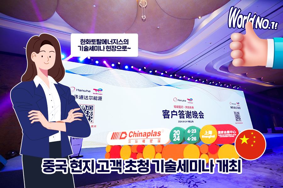 세계 최대 규모의 플라스틱 산업 전시회 ‘차이나플라스(CHINAPLAS)’가 지난 4월 23일부터 26일까지 중국 상하이에서 개최됐습니다. 한화토탈에너지스는 중국 상하이에서 차이나플라스에 참가한 고객사를 대상으로 기술세미나와 만찬 행사를 열었는데요. 한화토탈에너지스의 우수한 기술력을 선보였던 현장 속으로 함께 가보실까요?