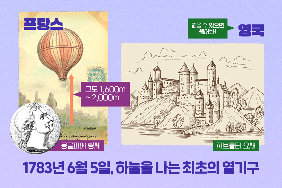 열기구의 발명은 군사 요새인 ‘지브롤터 요새’ 침입이 목적이었는데요. 형인 조셉 몽골피에는 기구를 사용해 공중에서 군대를 투입하면 어떨까하는 생각으로 열기구를 발명하기 시작했습니다.