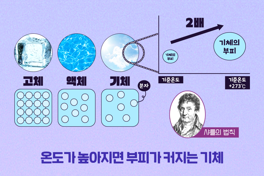 이때 온도가 높아지면 열에너지가 발생해 기체 분자의 운동을 활발하게 만드는데요. 분자의 움직임이 활발할수록 더 넓은 범위에 기체 분자가 퍼져 더 큰 부피를 차지하게 됩니다. 이 같은 기체의 성질을 정리한 것이 바로 ‘샤를의 법칙’인데요. 기준 온도에서 273℃가 올라가면 기체의 부피는 2배가 되는 기체의 성질을 설명하고 있습니다.