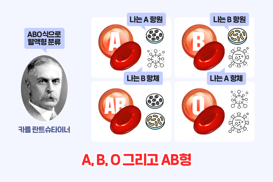 우리가 가장 보편적으로 사용하는 혈액형 구분 기준은 1901년 오스트리아의 생물학자 ‘카를 란트슈타이너’가 만든 ABO식 구분입니다. ABO식 혈액형은 혈액의 적혈구 표면에 있는 A, B 항원과 항체의 유무로 판단되는데요. A형은 A항원을, B형은 B항원을 가지고 있습니다. AB형의 경우 A항원과 B항원을 모두 가지고 있지만, O형의 경우 두 항원 모두 가지고 있지 않죠. 항체 유무는 반대인데요. A형은 B 항체를, B형은 A항체를 가지고 있습니다. O형은 두 항체를 모두 가지고 있으며 AB형은 항체가 없죠.