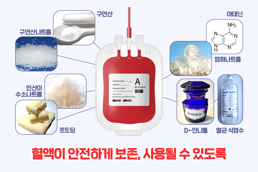 혈액첨가제의 경우 아데닌, 염화나트륨(NaCl), D-만니톨(C6H14O6) 등이 쓰이는데요. 아데닌은 단백질 합성과 DNA, RNA 구성요소이며 염화나트륨은 이온화를 위해 쓰이는 물질입니다. 마지막으로 D-만니톨은 일종의 식품 첨가제로 흡습성 성분의 결착을 막는 데 사용됩니다. 혈액 첨가제 안에서는 삼투압 효과를 저지합니다.
